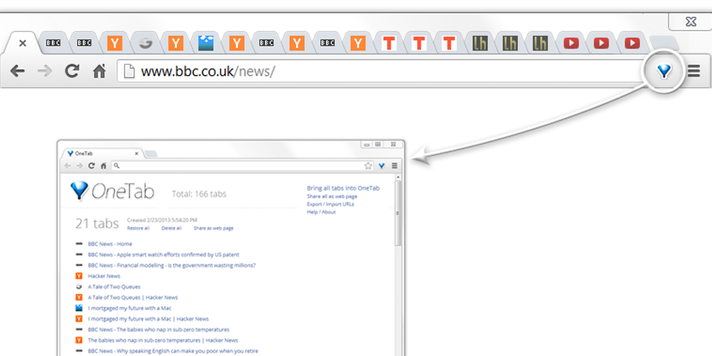 A Chrome-hoz és Firefoxhoz is telepíthető bővítmény az összes megnyitott lapfület lementi egy oldalra, így azok nem foglalják fölöslegesen a gép számítási kapacitását, ellenben bármikor kéznél vannak, ha szükség van rájuk. A OneTab emellett arra is képes, hogy az összes oldalt helyreállítsa, ami mondjuk bizonyos mennyiség felett már annyira nem jó ötlet, de mégiscsak megnyugtató tudni, hogy megtehetnéd.