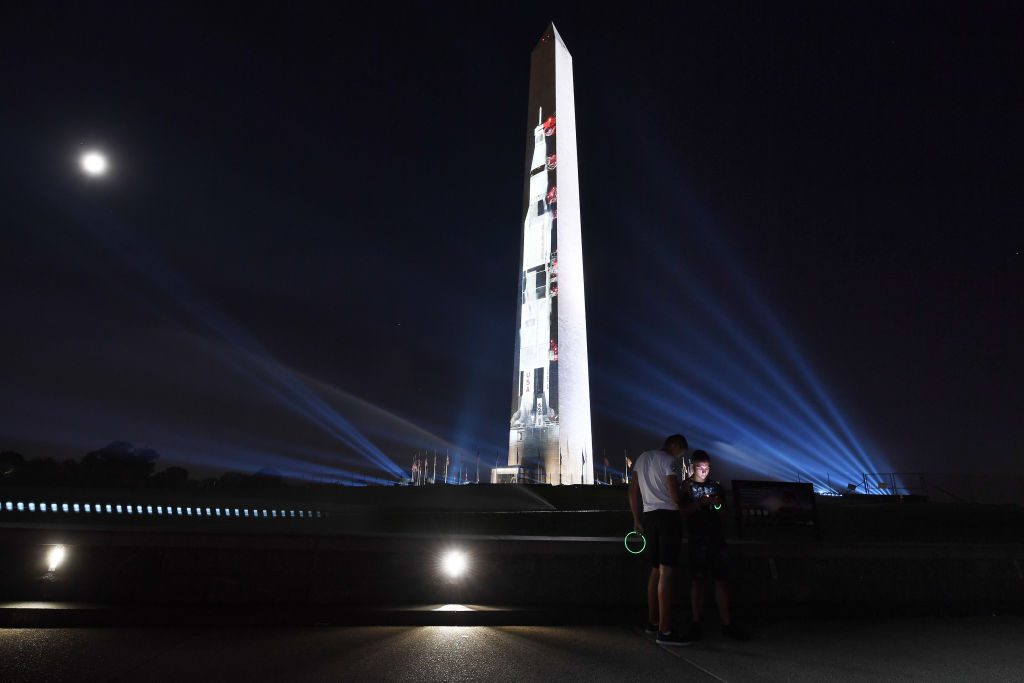 A washingtoni Smithsonian Légi- és Űrmúzeuma a holdra szállás ötvenedik évforfulója alkalmából döntött úgy, hogy a történelmet író Saturn V rakétát kivetítik a Washington-emlékműre.