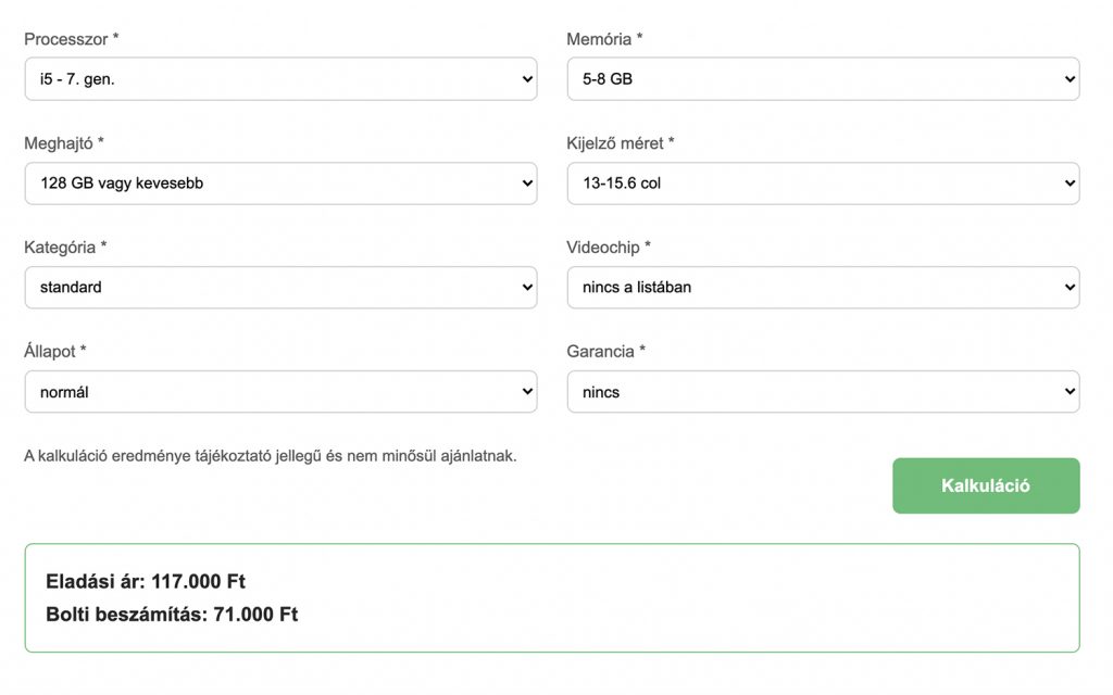 A HVG szúrta ki, hogy a budapesti Doctorhouse laptopszerviz készített egy szuper kalkulátort, amelyen algoritmusát úgy alakították ki, hogy a lehető legkevesebb – egészen pontosan nyolc – paraméter alapján is pontos eredményt adjon – ITT tudod megnézni, és valami ilyesmivel találkozhatsz: