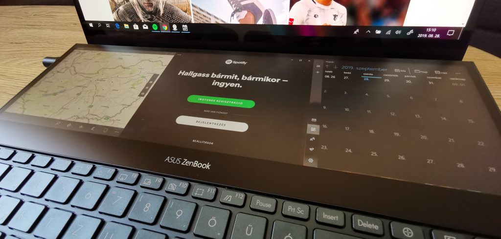 A tesztgépen egyszerre futott rajta egy Google Maps, egy Spotify és egy naptár. Tökéletes. Tegyük fel, dolgozol. Nincs szükség átkattintgatni a Spotifyra, ha zenét váltanál, ott van lent, bármikor használhatod akár érintésvezérléssel is. Ha a munkádhoz folyamatosan szükséged van a naptárra, egyből ott van, és ez iszonyúan hasznos tud lenni. A kijelző egyébként a kézírásodat is felismeri, a 15,6-os 4K OLED érintőképernyő pedig egyszerűen csodálatos képet nyújt, a Player legalábbis gyönyörűen festett rajta, de hát hol nem…