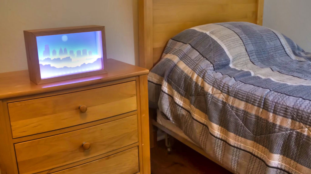És nem ám csak azt, hogy nappal van vagy éjszaka, de a hajnali derengést vagy az esti szürkültet is. Nelson viszont nem elégedett meg ennyivel, és a kép mögött mozgó LCD-kijelzővel a Nap és a Hold járását is lemodellezte, amit szinkronizált a valódi napkeltével és napnyugtával.