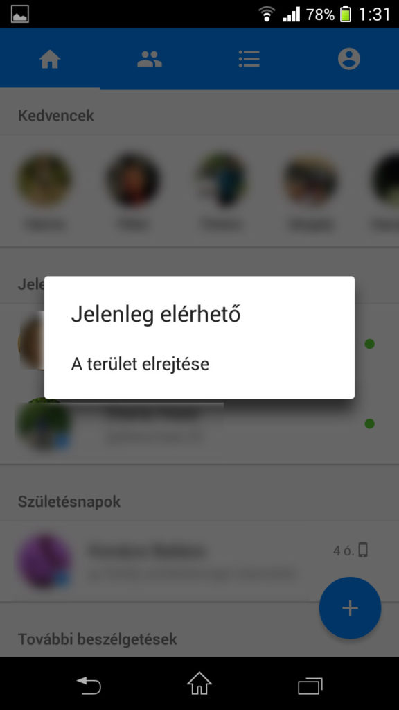 Ha a kezdőlapon legörgetünk a jelenleg elérhető listához, majd hosszan nyomunk bármelyik ismerősünkre, megjelenik a "terület elrejtése" opció.