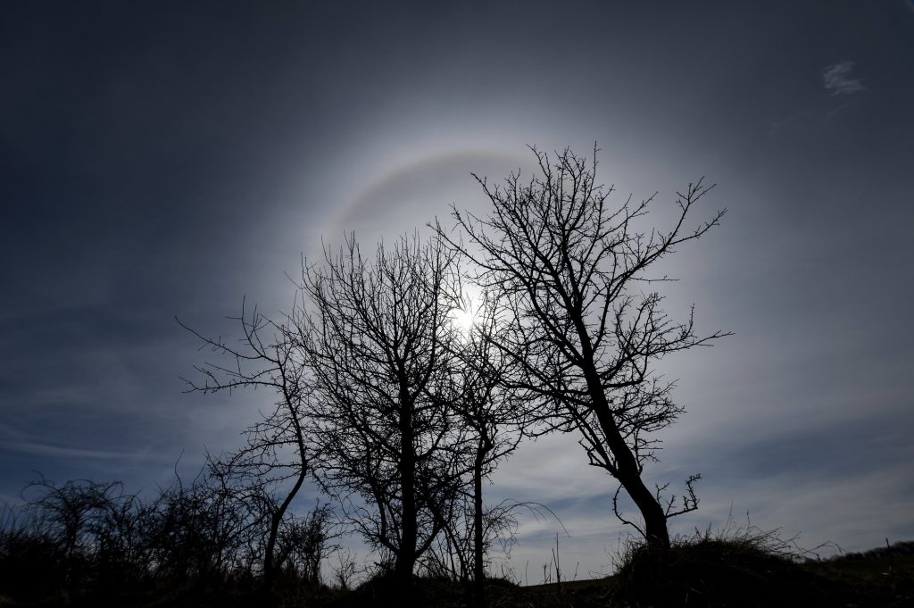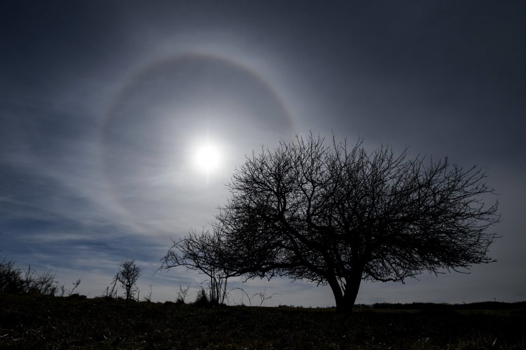 A Nap körül megjelenő optikai jelenséget a nyolc-tizenkét kilométer magasan képződő fátyolfelhők vagy pehelyfelhők jégkristályain megtörő fény idézi elő. Egy ilyen halót fotózott Komka Péter Salgótarján közelében március 28-án.