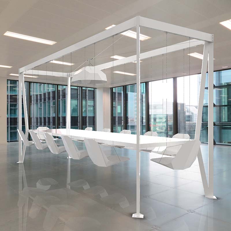 Mi az, ami mellett még a legmenőbb, játékszobával, bokszzsákkal és csocsóval felszerelt Google-iroda is csak egy unalmas, szürke hivatali lyuknak tűnik? Természetesen a lengőasztallal felszerelt konferenciaterem! Az egyhangú negyedéves jelentéseket garantáltan fel fogja dobni, ha a hallgatóság önfeledten hintázhat a grafikonok bámulása közben, bár a cég gazdasági osztályán biztosan nem fognak táncra perdülni a hintaasztal 8500 fontos (azaz hárommillió forintos) árának hallatán.