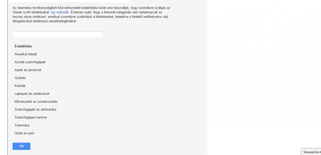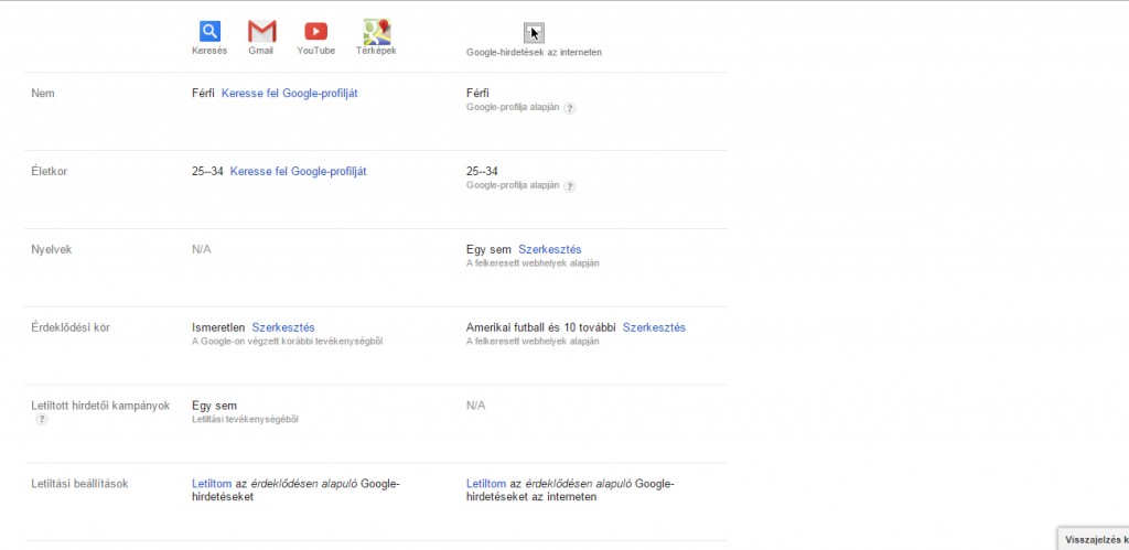 Az oldalra belépve rögtön kiderül, hogy a Google lényegében semmit nem tud rólam, még azt sem, hogy milyen nyelveket beszélek. Azt mondjuk jól eltalálták, hogy 25 és 34 közötti férfi vagyok, de ezeket az adatokat a GMail fiókom alapján nem lehetett túl nehéz felhajtani.