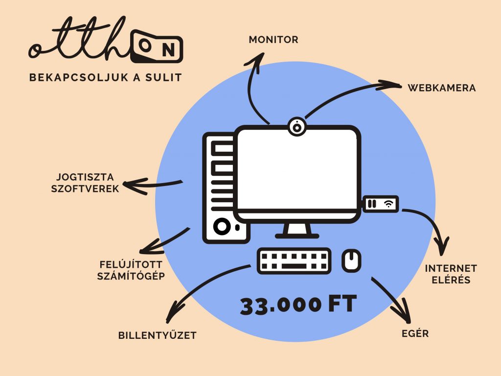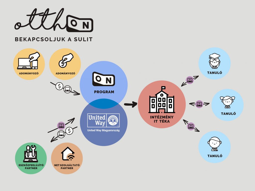 Az otthON Program célja, hogy már 33 ezer forintból olyan otthontanuláshoz szükséges eszközt biztosítson annak a több tízezer iskolás korú gyereknek, akik megfelelő infrastruktúra hiányában nem tudnak részt venni az iskolai távoktatásban a karantén ideje alatt. Új gépek helyett használt eszközökre gyűjtenek, ami amellett, hogy az optimális ár miatt a lehető legtöbb gyerek távoktatását teszi lehetővé, a fenntartható gondolkodást is erősíti a diákokban.