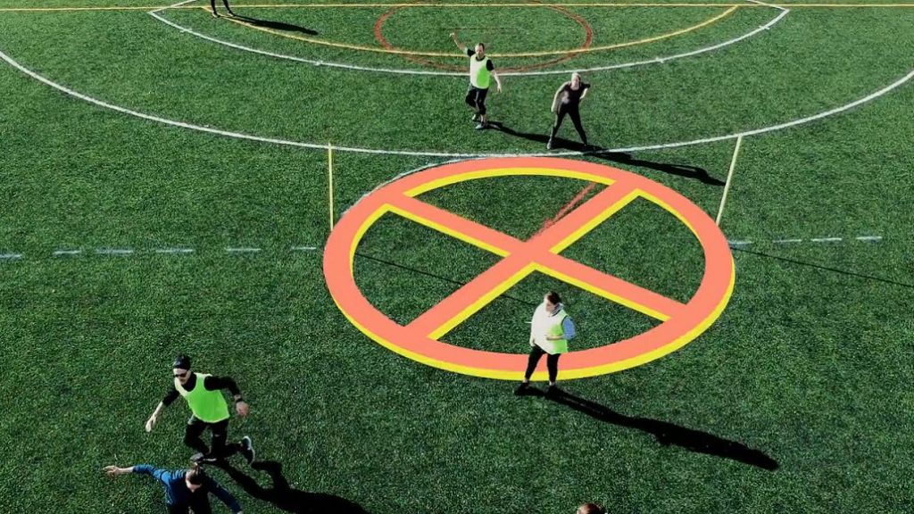 - Ahhoz, hogy gólt szerezhess, a labdát előbb át kell juttatni a középső kapun, erre a területre viszont a játékosok nem mehetnek, vagyis értelemszerűen passzolni kell.