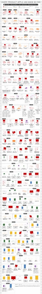 Az Apple mindig is híres volt arról, hogy más cégekhez képest viszonylag szűk a portfoliójuk, éppen ezért lehet elsőre megdöbbentő az a grafika, ami a cég 1976-os alapítása óta gyártott összes terméküket mutatja be.