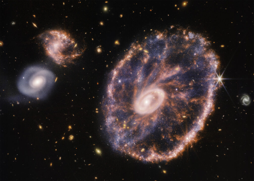 A csillagászok egyelőre még nem tudták pontosan azonosítani, hogy melyik galaxis ütközött a kocsikerékké alakuló galaxissal, de a három jelölt közül kettő is látható a fenti, egyébként a James Webb űrteleszkóp által készített felvételen – a kép bal felső részén az a két nagy galaxis.