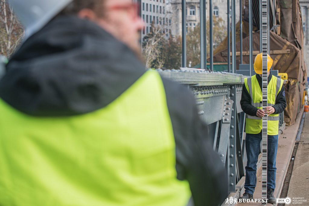 Közben a hídról és a Duna-partról 0,5 milliméter pontosságú geodéziai műszerrel mérték a híd lehajlását. A lánckötegeken, a függesztőrudakon, a bent maradó, régi hídszerkezeten, illetve az új acélpályán elhelyezett nyúlásmérő bélyegek segítségével azt figyelték, milyen alakváltozások jelennek meg a szerkezetben, és milyen feszültségek keletkeznek az egyes elemekben. A budai pillér tetején lévő koronasaru-teremben a koronasaru elmozdulását is monitorozták.