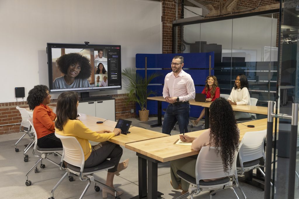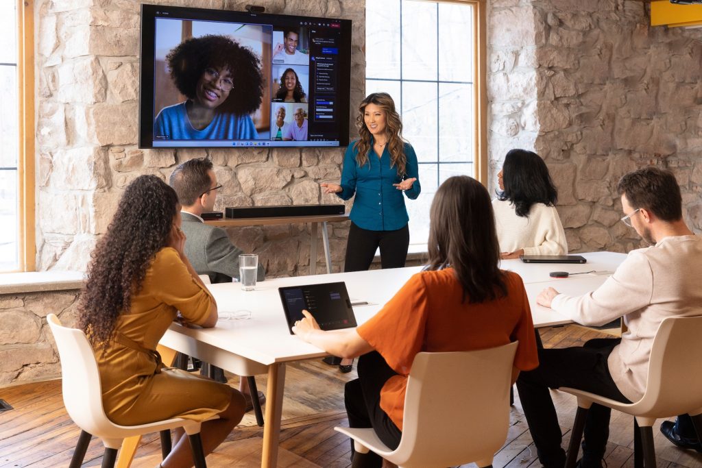 A rendszer kiváló kamerát kapott, mesterséges intelligenciával, ami követi a sétálgató előadót, reagál, ha valaki elhagyja a meetinget vagy épp csatlakozik: az egyedül maradt kollégára rázoomol, de ha többen is bejönnek a terembe, akkor kizoomol, totálképet mutat.
