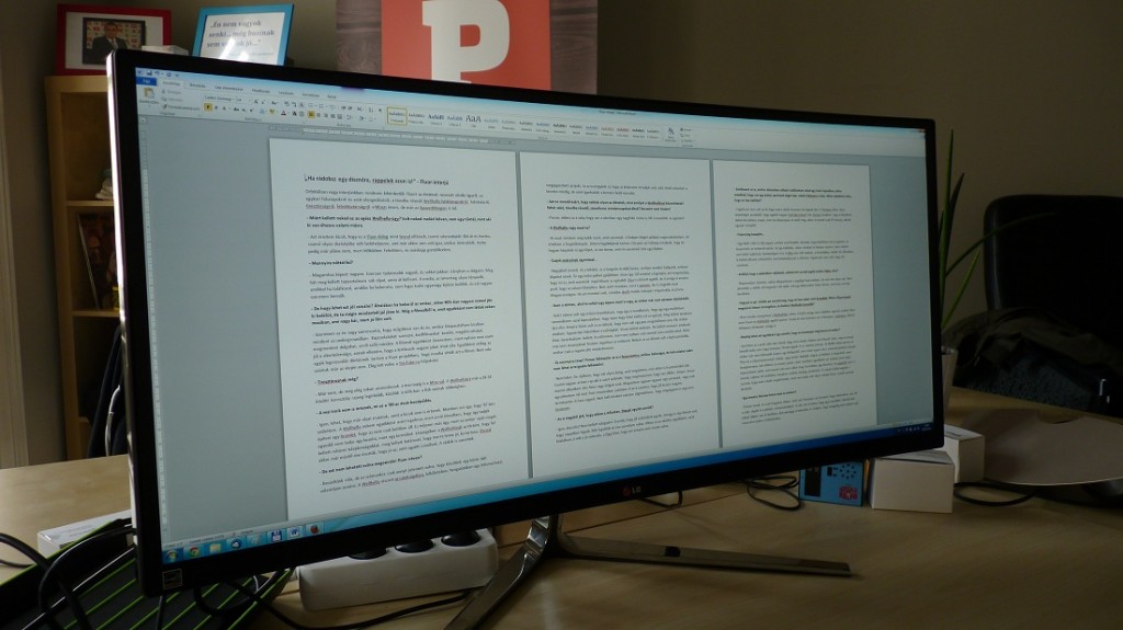 Alapjaiban véve nem ezt a monitort ajánlottuk volna szövegszerkesztéshez, de aztán rájöttünk, hogy mi vagyunk a bénák. Az arányai egyáltalán nem feltételezik, hogy ilyesmire is megfelel, aztán kapcsoltunk, hogy hoppá, hát mi van akkor, ha többoldalas megjelenítést választunk, így bátran láthatjuk például az elkészült interjút is kvázi egyben. A monitor íveltsége itt már kicsit zavaró, de egyáltalán nem megszokhatatlan, két nap múlva már furcsa volt visszaállni a régire, és ezt a fájdalmat kénytelenek voltunk némi mortalozással enyhíteni.