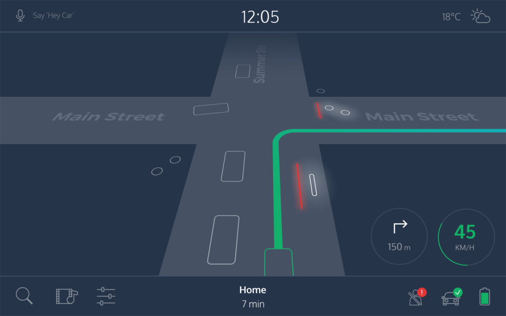 Az elv az, hogy veszélyhelyzetben most is a vezetőre pillantunk, észlelte-e, a vezető arca jelen esetben a kijelző lesz, bejelölve rajtuk a veszélyforrásokat, például a gyalogosokat, az utasok így nyugodtabbak lehetnek, mert látják, hogy a kocsi is mindent érzékel.