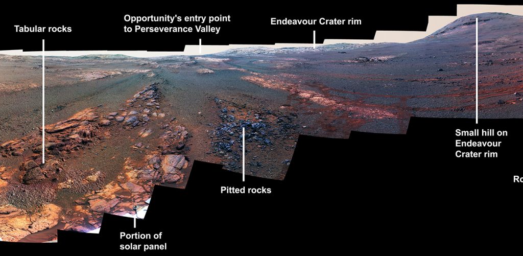 A 354 képből álló panorámafotót nem volt könnyű elkészíteni, az Opportunitynek majdnem egy hónapba telt összehozni, és június 10-ig, vagyis gyakorlatilag az utolsó leheletéig dolgozott rajta. Mivel az eredeti fotó 23123x5163 pixeles és 83 megabájtos, ezért itt csak egy nagyon lebutított változatát tudjuk közölni, de a NASA oldalán annyira bele tudsz nagyítani, hogy még a kis kavicsok is tisztán kivehetőek (lapozz lefelé, aztán a kép bal felső sarkában nyomj a negyedik gombra a teljes képernyős módhoz).