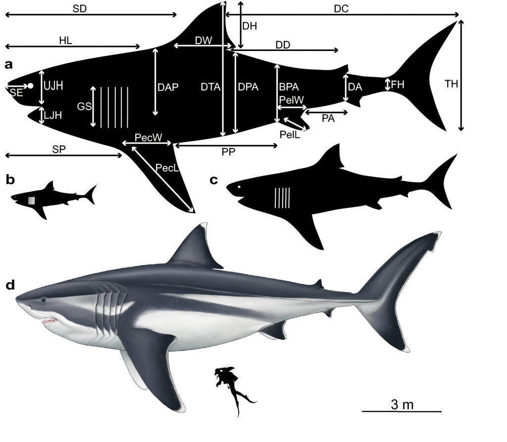 A tanulmányuk szerint a megalodon 16 méteres volt, ebből a feje 4,65 méter, a hátúszója 1,62 méter, a farka pedig 3,85 méter hosszúságú. Mint írták, ez azt jelenti, hogy ha egy felnőtt ember felállt volna a cápa hátára, nagyjából egyforma magas lett volna a hátúszójának hosszával.