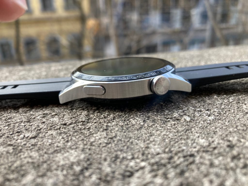 A Watch GT 3 tok polírozott, a tokfülek pedig szépen keskenyednek, hogy kényelmesen körülöleljék a csuklót, ráadásul a könnyebb navigálás érdekében kapunk egy jelzett, forgatható koronát is.