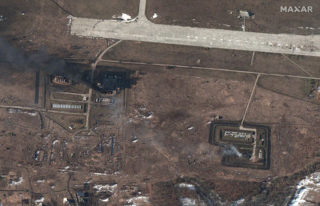 A háború első napján több ukrán légibázist is támadás ért, az amerikai Maxar Technologies űrtechnológiai vállalat műholdfelvételén a csugujevi légi támaszpontot ért támadás nyomai láthatóak: