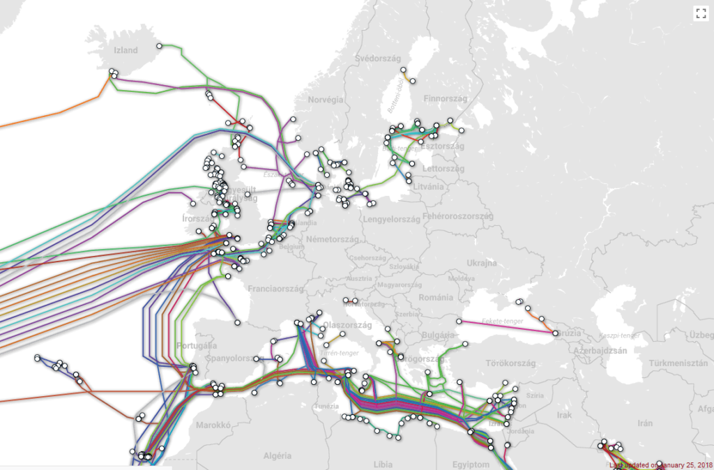 A TeleGeography térképén több mint 200 víz alatti kommunikációs kábel található, amelyek országokat, valamint kontinenseket kötnek össze. A teljes interaktív térkép ide kattintva nézhető meg, addig is lássuk, hogyan fest Európa:
