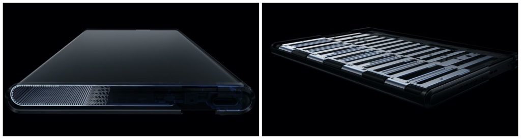 A kijelző ki- és betekeréséről a készülék belsejében elhelyezett görgők felelnek, amelyek mindkét oldalán azonos erővel húzzák ki és be a panelt. És hogy a legvékonyabb pontjain 0,1 milliméter vastagságú OLED kijelző ne sérüljön meg, egy úgynevezett Wrap Track elnevezésű, nagy szilárdságú réteggel borították be, de erről többet nem árul el az Oppo.