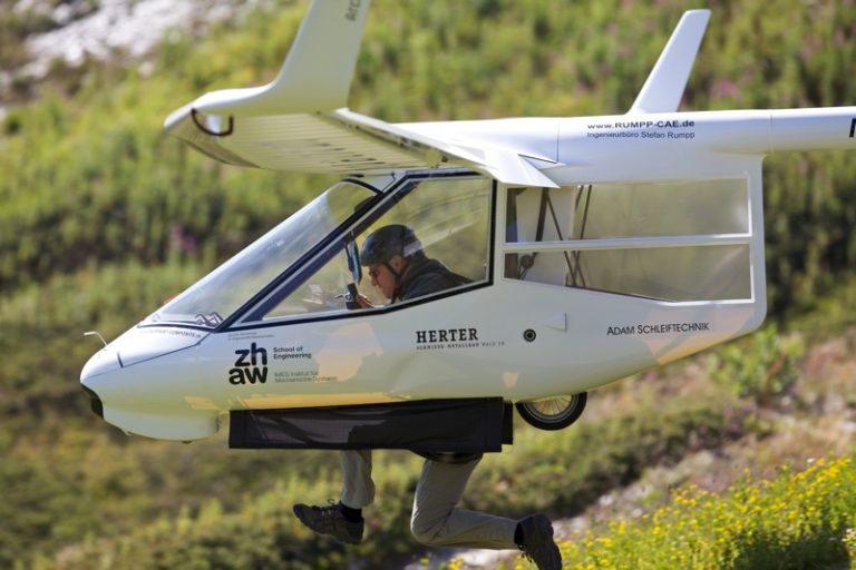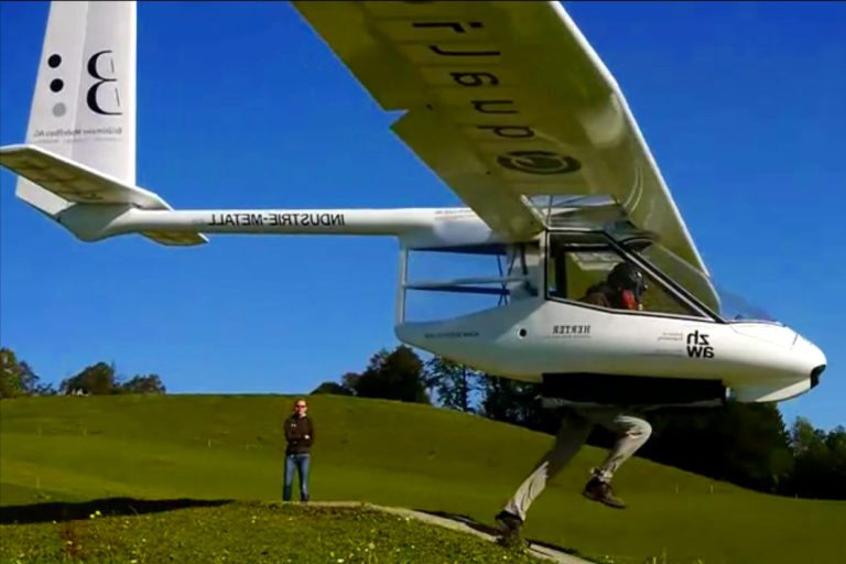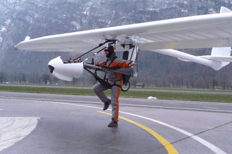 Hogy miért nem valódi? Mert a svájci Rupper Composite által gyártott Archaeopteryx egy vitorlázó repülőgép, és azok közül is egészen egyedi: a gép alján van egy önmagától nyíló és csukódó ajtó, így elég felmenned egy dob tetejére, a fejedre kapnod a repülőt, aztán jól nekifutni. Amint a levegőben vagy, a nyílás automatikusan bezáródik, így nem kell attól félned, hogy a repülés zuhanással fog végződni.