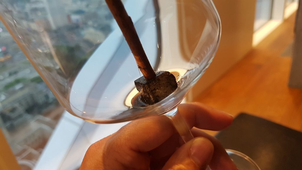 Jól látod, ez bizony egy favesszőre szúrt bigyó, ami fekete színű, illatában faszénre, ízében pedig valamilyen szőlőféleségre hajaz. A séf szerint ennek az akárminek fekete az íze, mi meg nem vitatkoztunk vele, mert nem értünk hozzá.