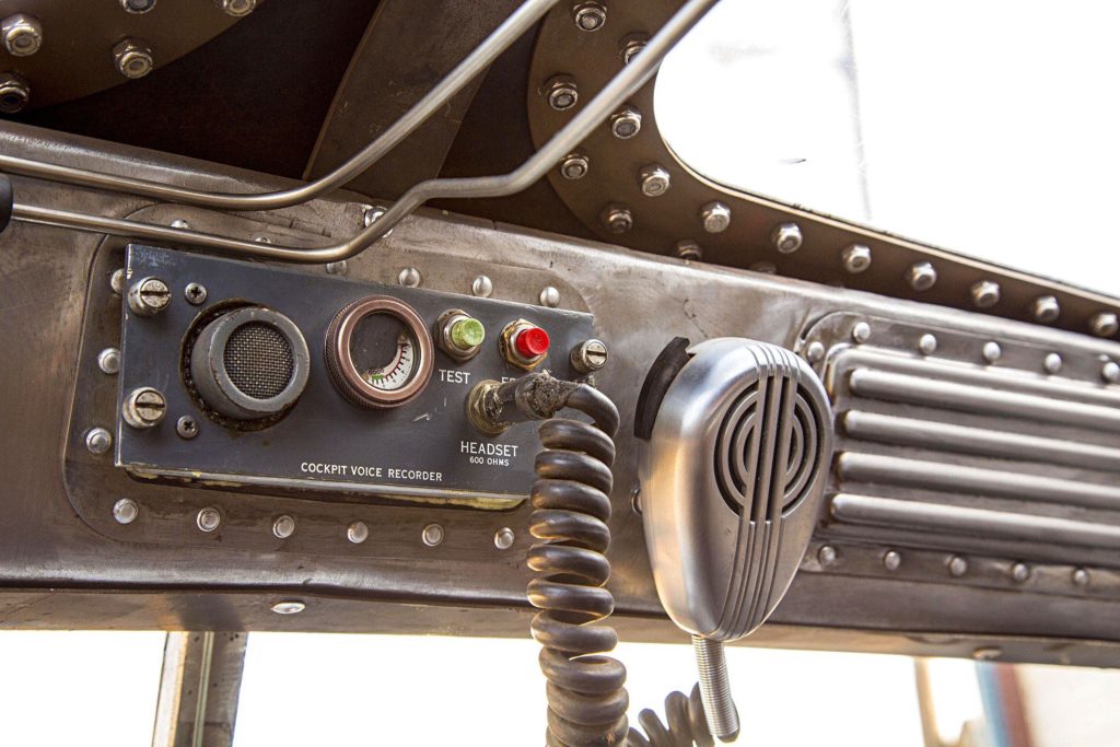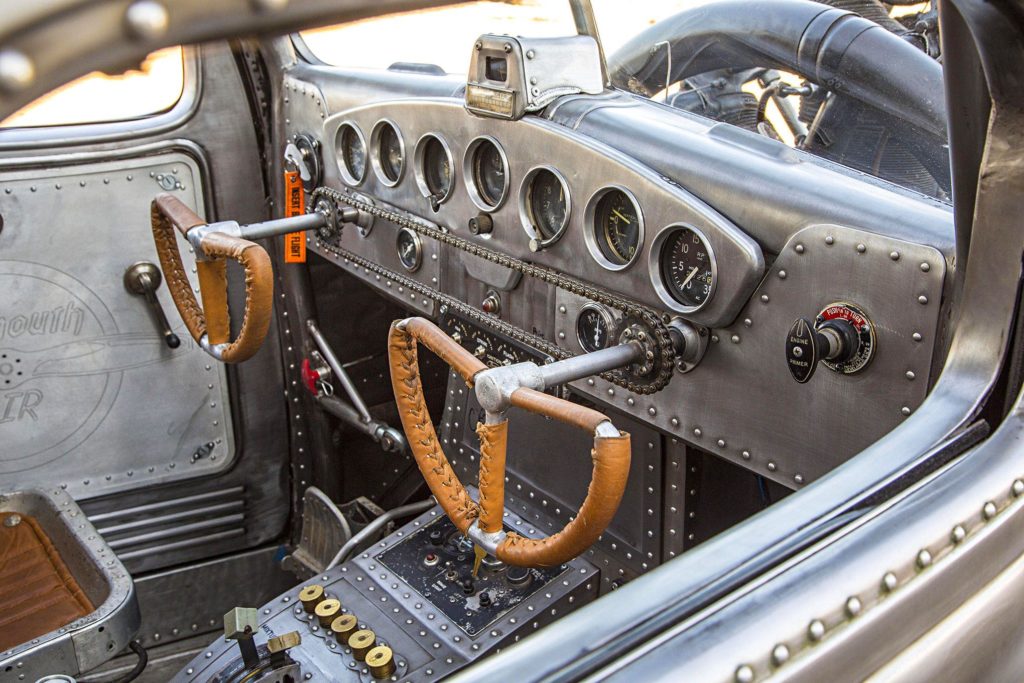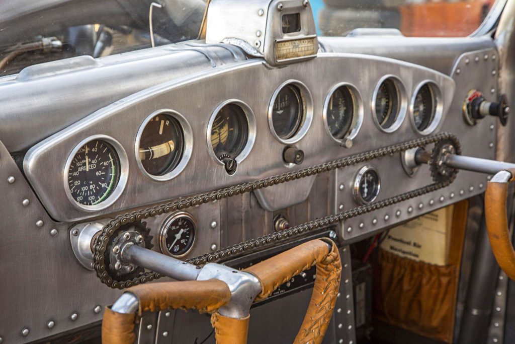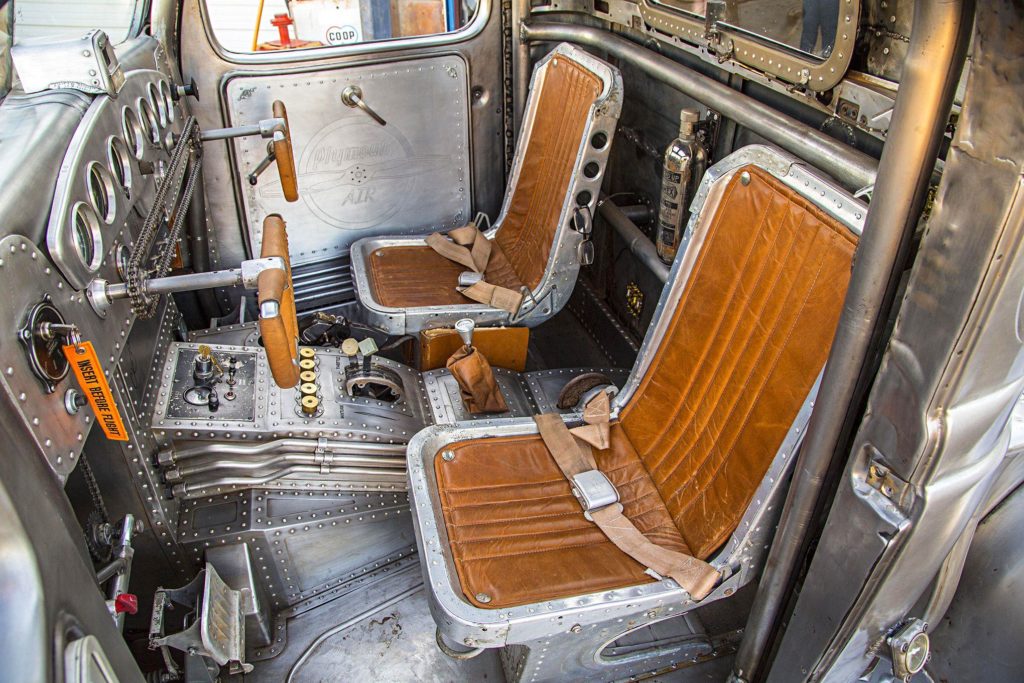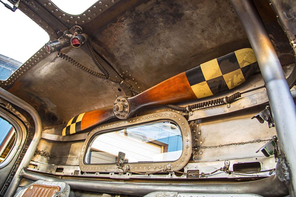 Az átalakítás nem merült ki ennyiben: az utastér is repülős hangulatú lett, még egy légcsavar is ott van dísznek, a karosszéria pedig fémtisztára csiszolva, némi kiegészítővel teszi tökéletessé az alkotást.