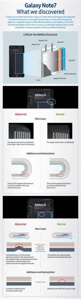 A Note 7-et két különböző akkumulátorral gyártották, amelyek közül az egyik eredetileg is hibás volt: a Samsung SDI által gyártott akksikba már a tervezés során hiba csúszott, így az akkumulátor egyik sarkában az elektródák elhajlottak, rövidzárlatot okozva. A telefon piacra kerülése után először ezek a telefonok kezdtek el kigyulladni, aminek következtében a Samsung szeptemberben vissza is hívta a hibás telefonokat.
