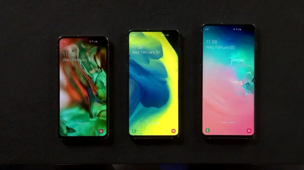 A telefonok már a méretükben is eltérnek egymástól, a "Lite" verziónak megfelelő S10e 5,8 colos kijelzőt kapott, a sima S10 6,1 colos, az S10+ 6,4 colos, míg az 5G-s modell 6,7 colos kijelzővel érkezik. A kijelző felbontása nem változott az elődjéhez képest, (az S10e-t leszámítva) továbbra is 2960x1440 pixeles, viszont dizájn szempontjából nagy különbség, hogy az új telefonok Infinity-O kijelzővel érkeznek, vagyis az előlapi kamera a képernyő jobb felső sarkába, egy kameralyukba került.