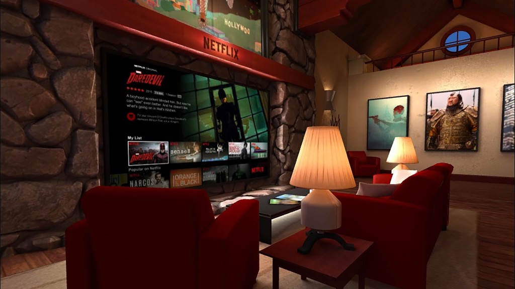 Ez tartalmilag teljesen megegyezik a "normál" Netflixszel, viszont a filmeket és videókat egy bámulatosan élethű virtuális nappaliban nézhetjük meg, aminek közepén egy hatalmas képátlójú tévé díszeleg. A hatás annyira magával ragadó, hogy komolyan koncentrálnod kell, nehogy a kezedben szorongatott kólát vagy sós mogyit megpróbáld lerakni magad mellé a kanapéra, ami valójában persze nincs ott.