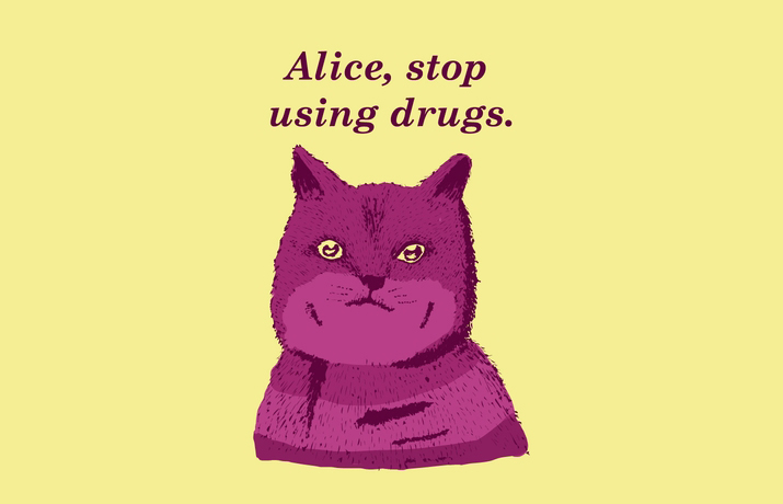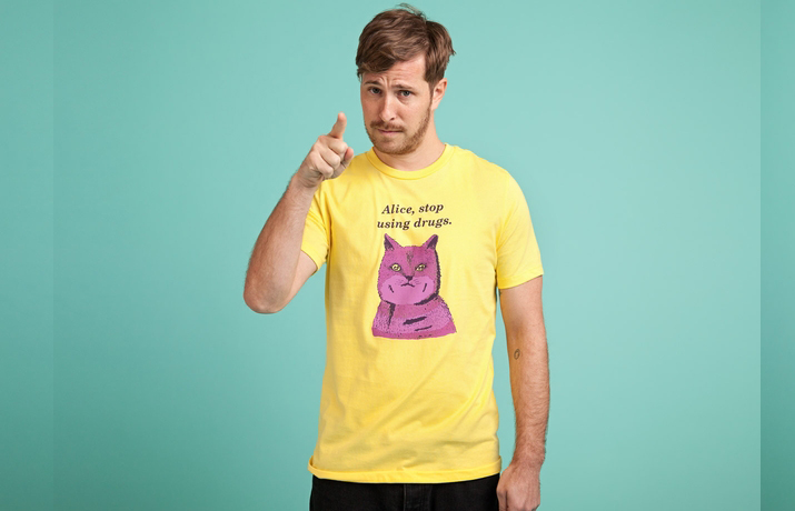 Igen, ott már gáz van, ha egy tizenéves kislány egy cvikkeres nyúl után mászva olyanokat flessel, hogy minden egyszerre nő és zsugorodik, egy hatalmas hernyó vízipipázik, hatórai, örökké beragadt teapartin sztorizik, krikettezni akar egy flamingóval és kétlábon járó kártyakatonák őriznek egy bolond királynőt – nem is beszélve a talán leghíresebbé vált, abszurd karakterről, a Cheshire macskáról. Ő az a hatvanöt foggal vigyorgó dagadt lila macska, aki a fa tetejéről osztja az észt a folyton eltévedt Alice-nak – majd eltűnik és csak a vigyora marad a levegőben. Ha te is egyetértesz, hogy mondjuk legalább hatféle drog tüneteit mutatja ez a szürreál mese, akkor szerezd be a vicces cicás sárga pólót a Threadlessről.