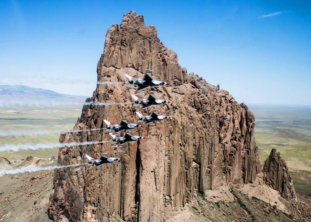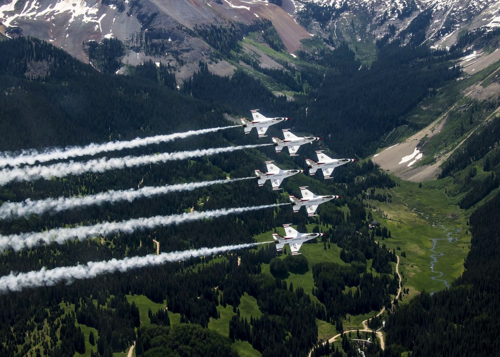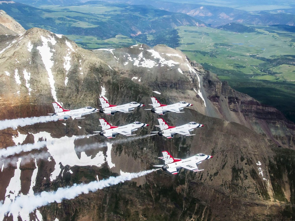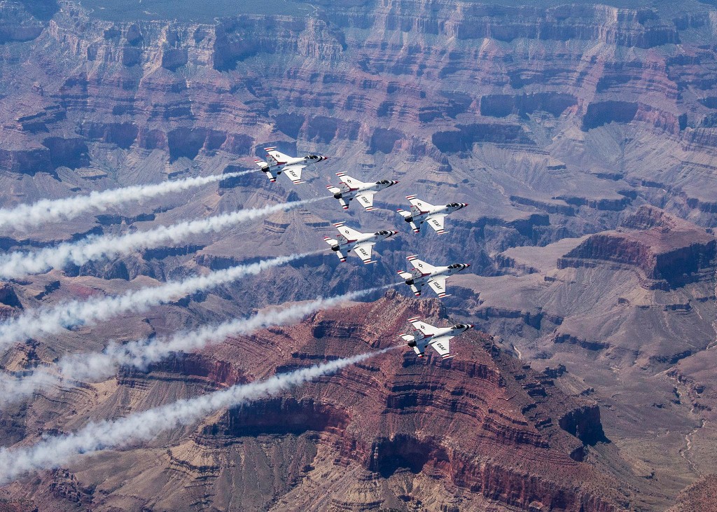 A jellegzetes festésű F-16-osok úgy repkednek a gyönyörű coloradói hegyek és a Grand Canyon sziklái között, mintha egymáshoz lennének ragasztva. Ezt a mutatványt még a magasban is csak nagyon kevesen tudnák így megcsinálni, hát még a hegyek között, néhány száz méteres magasságban.