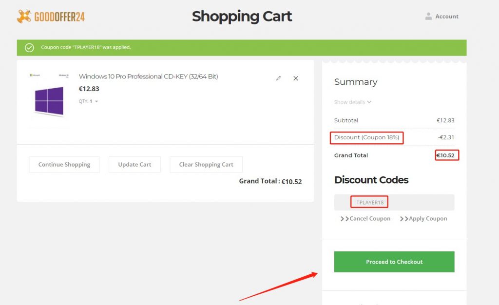 2. A kosárnál add meg a Discount Codes mezőben a TPLAYER18 kódot, majd kattints az Apply Coupon feliratra!