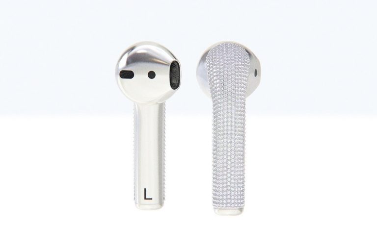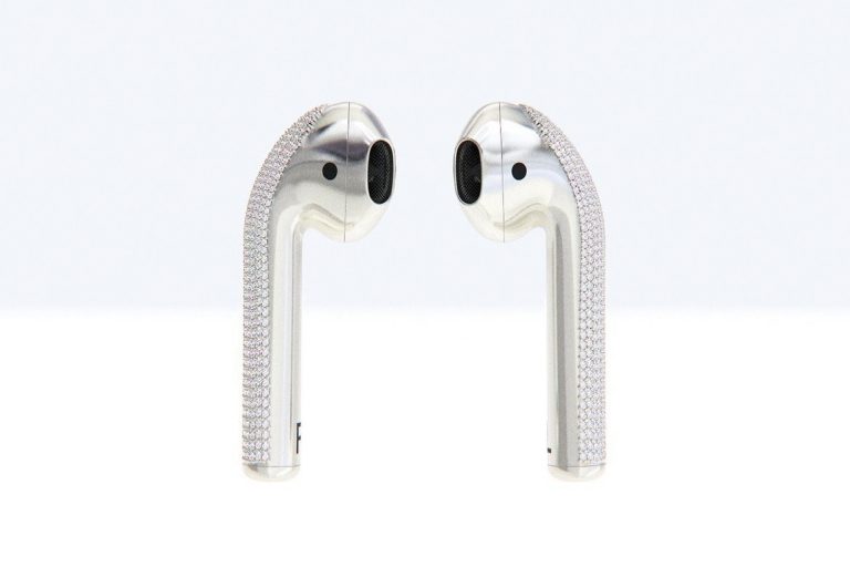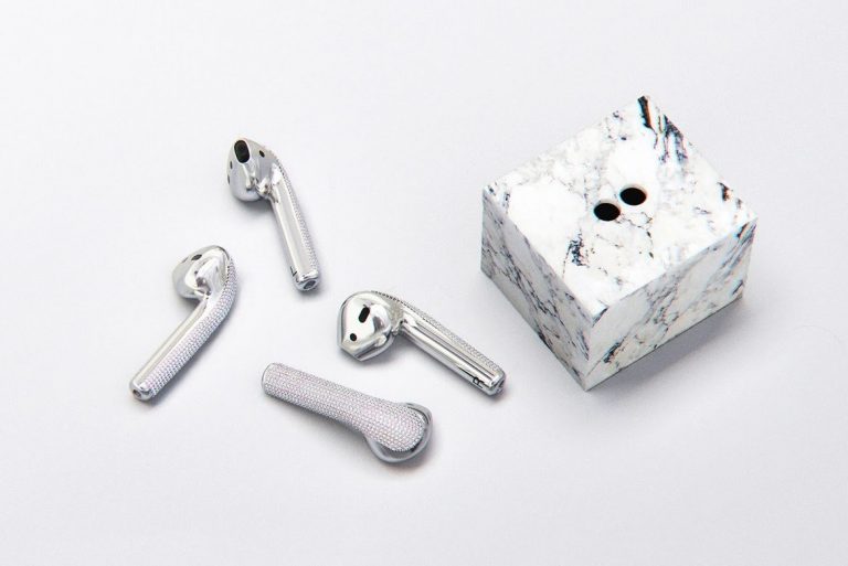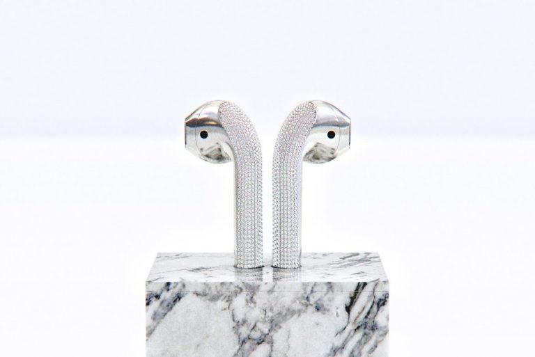 A Los Angeles-i művész azt találta ki, hogy fehérarannyal vonja be az Apple vezeték nélküli fülesét, majd megszórta kereken tízezer darab apró gyémánttal.