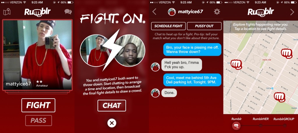 Az ötlet szerint a Rumblr pont úgy működött volna, mint például a Tinder, vagyis a verekedni vágyók regisztráció után jobbra-balra húzogatással válogathattak volna a többi pofonláda között, és ha egymásra találnak az igazival, akkor máris lefixálhatják a helyet, ahol majd péppé verik egymást. Extraként az alkalmazás egy térképet is mutatott volna a közeledben éppen zajló bunyókkal, amibe akár be is kapcsolódhatsz - ebben a tekintetben simán felülmúlta a Tindert.