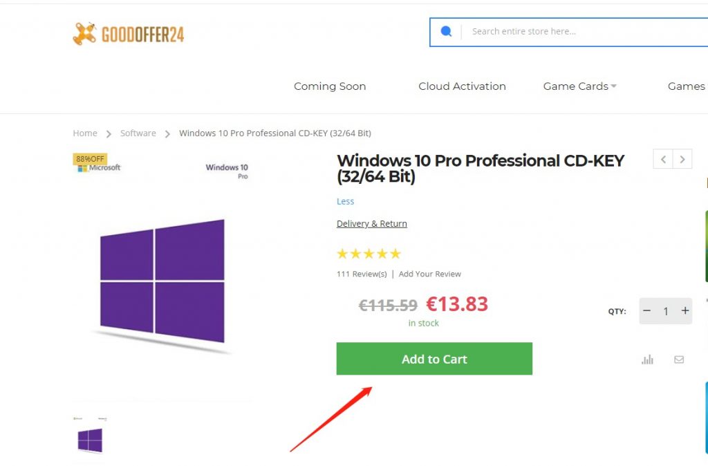 A Goodoffer24.com-on való vásárlás valóban olyan könnyű, mint amilyennek tűnik. Íme egy rövid magyarázat a Microsoft Windows 10 Professional Key vásárlásáról az TPLAYER15 kedvezménykód felhasználásával. Csak kattints a "Kosárba tesz" ("Add to cart") gombra az elem termékleírásában!