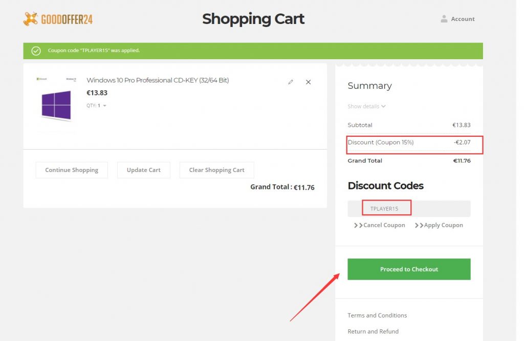 A bevásárlókosárban kattints a "Kuponkód alkalmazása" ("Apply coupon code") gombra, és írd be az TPLAYER15 kedvezménykódot! Majd azután kattints a Kedvezmény alkalmazására ("Apply Discount"), így az engedmény levonódik a megrendelés értékéből.