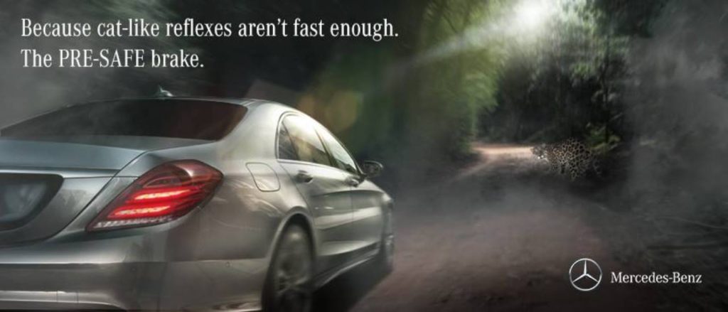 A Facebookon közzétett kép tanúsága szerint a Jaguar "macskareflexei" pont semmit sem érnének, ha a német autókban nem lenne pre-safe brake fékasszisztens, amely (a Blas Plus rendszerrel együtt) akár magától is képes elkerülni a gyalogosgázolást anélkül, hogy a fékre lépnénk. Touché!