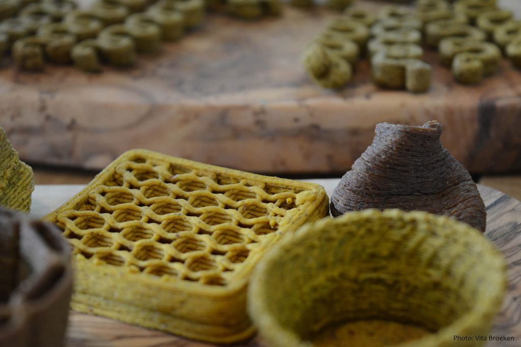 Elzelinde így készült snackjei például olyan gyönyörű mértani szerkezetek, hogy a Pekingi Design Héten ki is állították, vagyis nagyon úgy tűnik, hogy 3D-nyomtatással fine dining látszatú falatkákká lehet varázsolni a kidobott ételeket.