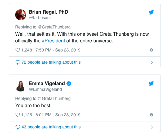 És akkor jön a fejlemény: Greta Thunberg is látta a videót és egy tweetben maximálisan jóvá is hagyta: