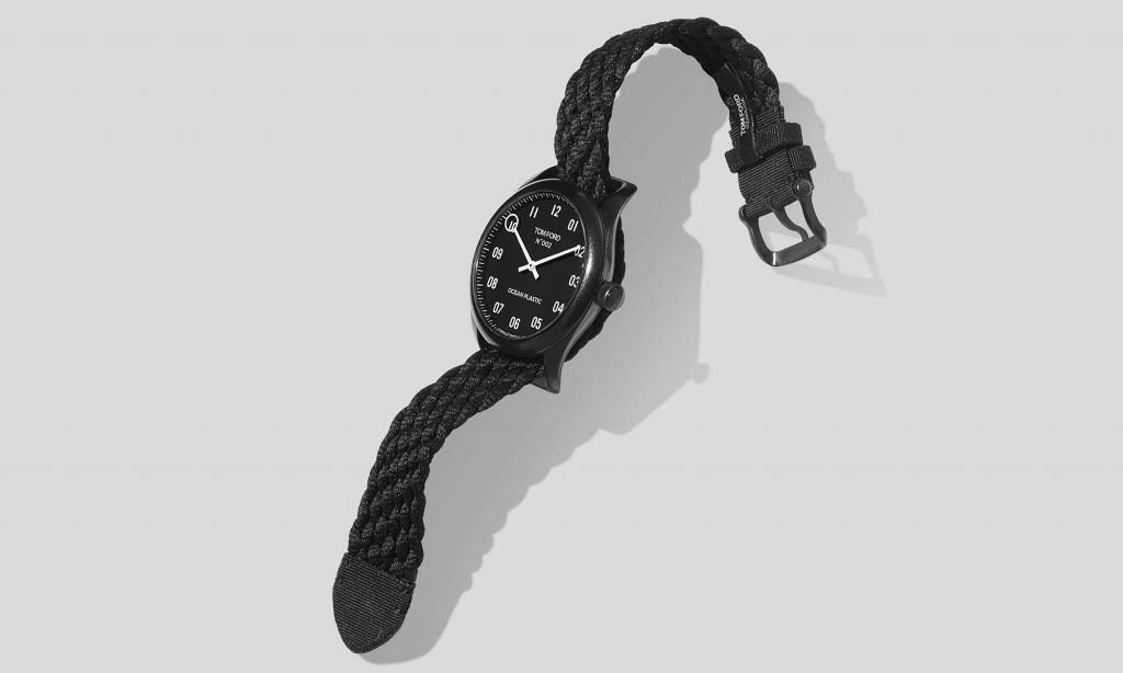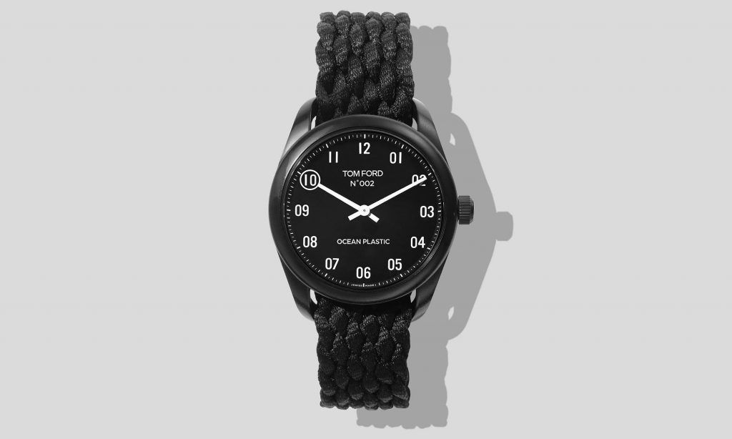 Tom Ford új karórája a 002 széria darabja, de a 11 490 dolláros modellel ellentétben nem aranyból, gyémánttal és aligátorbőr szíjjal készült, hanem az óceánokból kihalászott műanyaghulladék felhasználásával. A 40 milliméteres tokja és a fonott szíja is újrahasznosított műanyagból van, matt fekete számlappal és lumineszkáló számokkal, egyedül a hátlapot készítették rozsdamentes acélból.