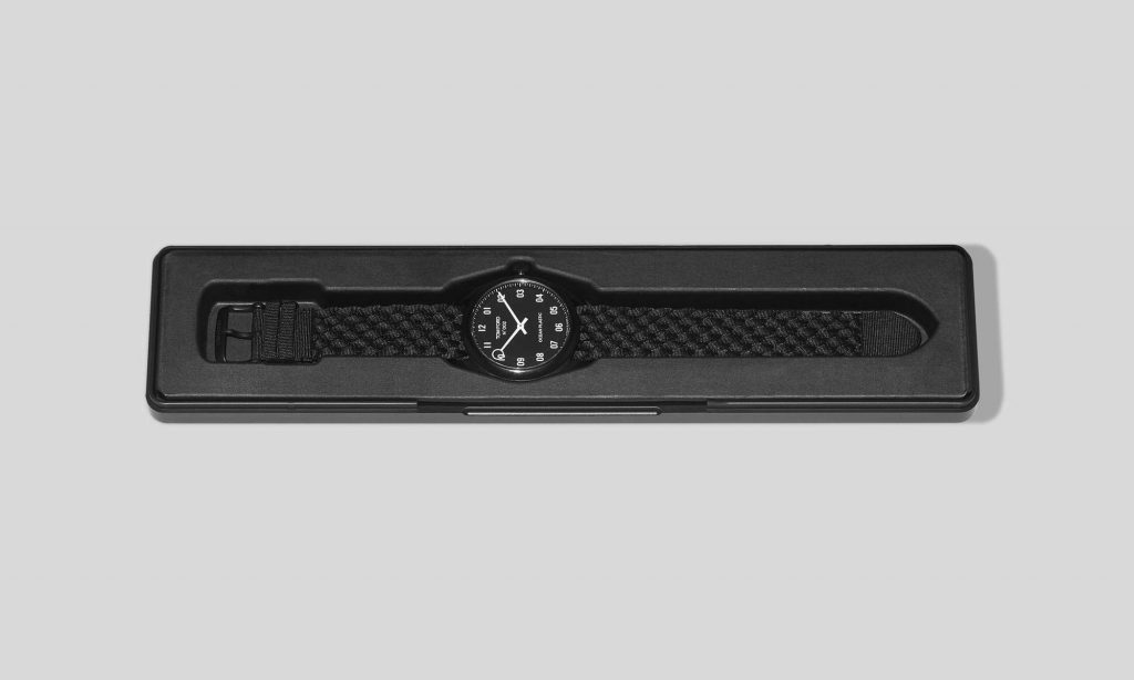 A fenntartható téma a csomagoláson folytatódik, az óra dobozát is újrahasznosított anyagokból állították össze.